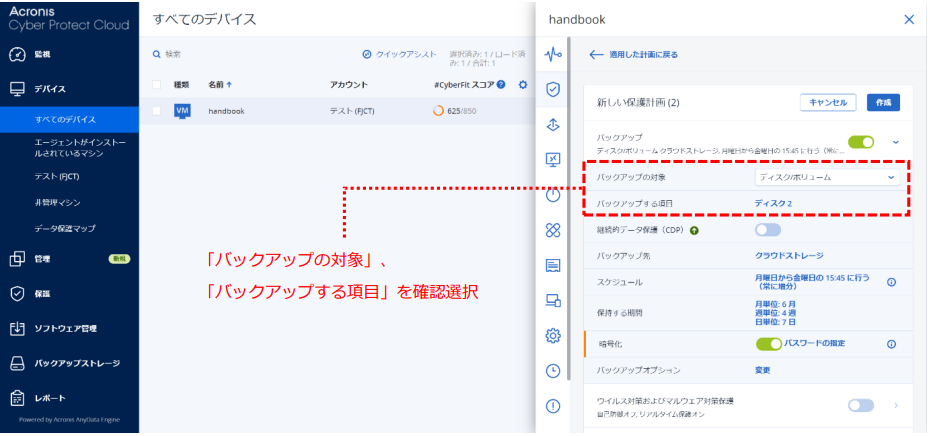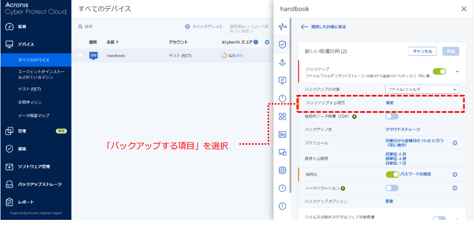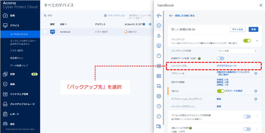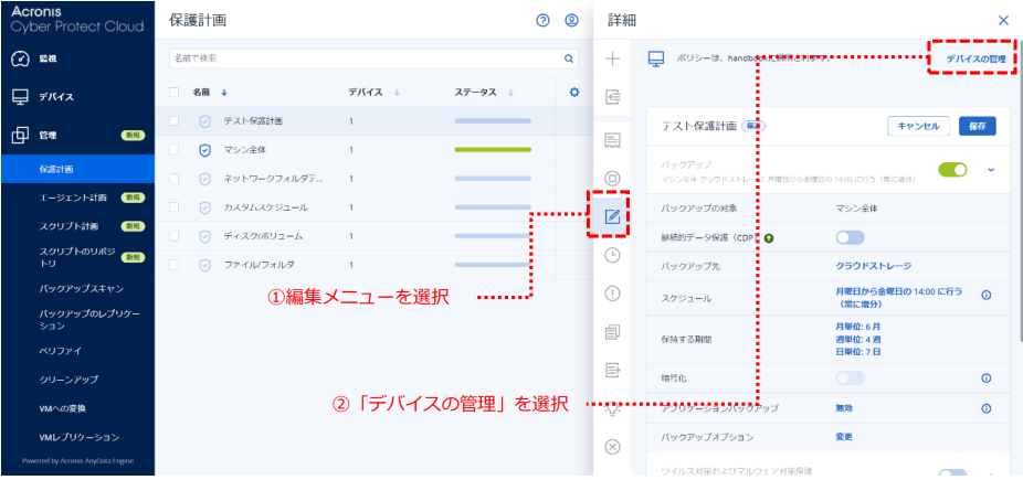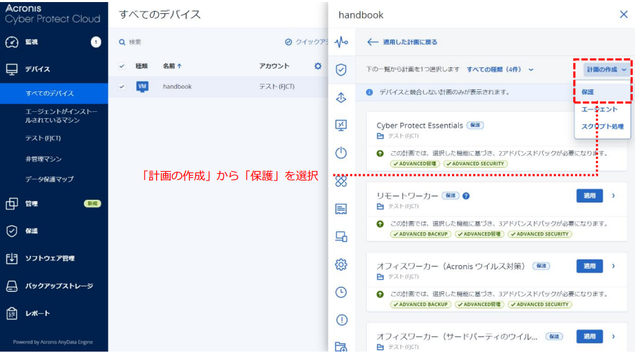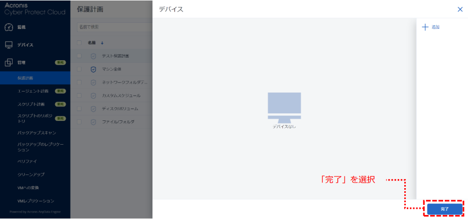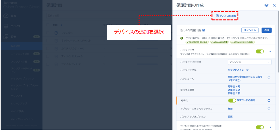 • [管理] 内、[保護計画] タブでの操作:保護計画を作成後にデバイスを選択します。