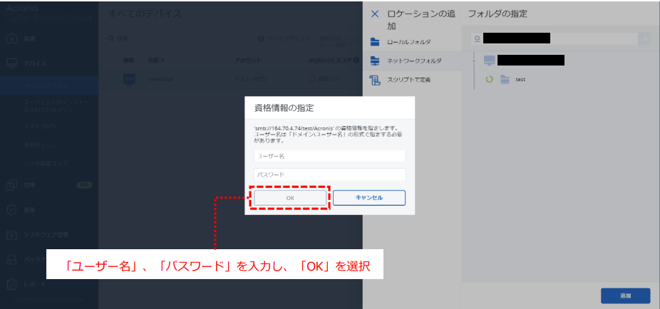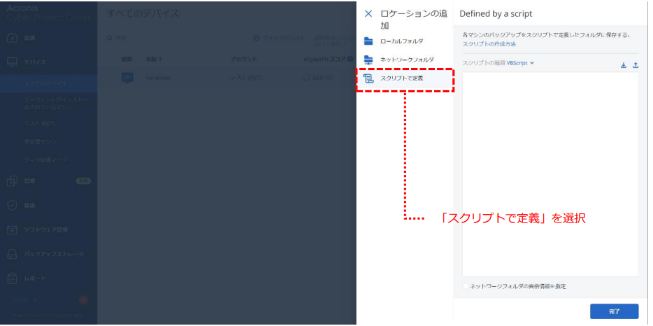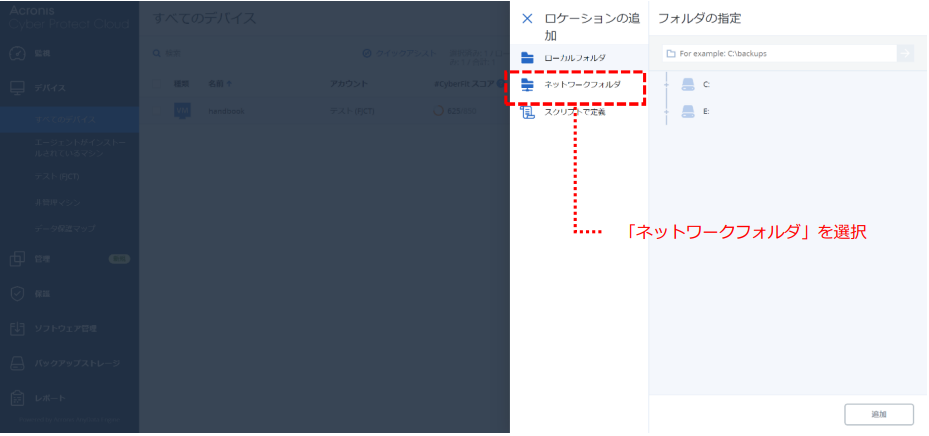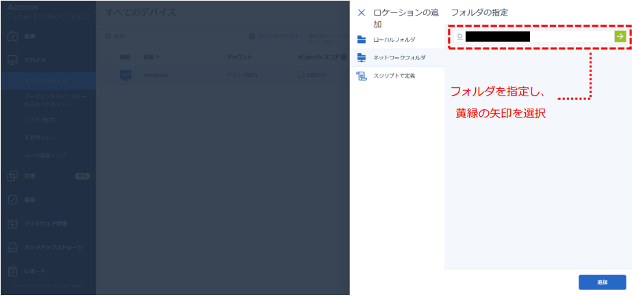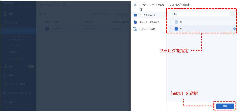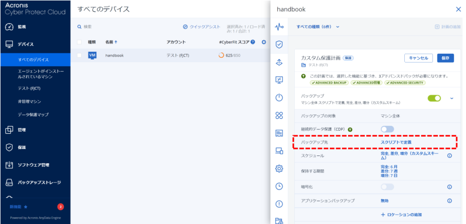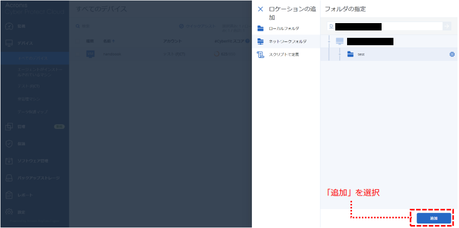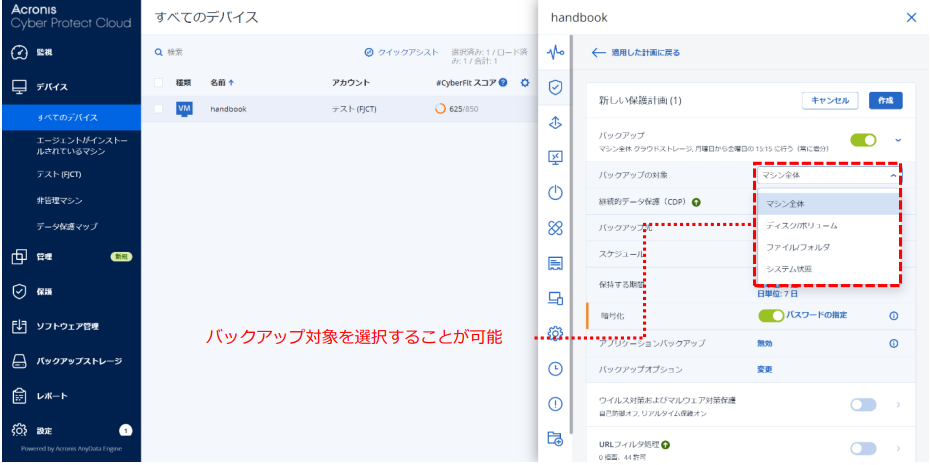 • [管理] 内、[保護計画] タブでの操作:保護計画を作成後にデバイスを選択します。
