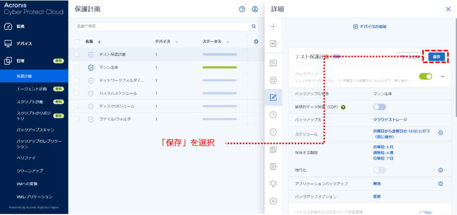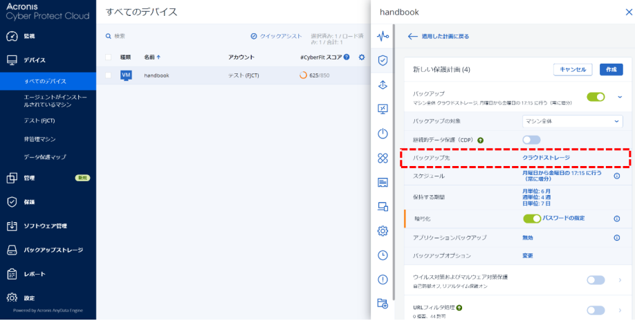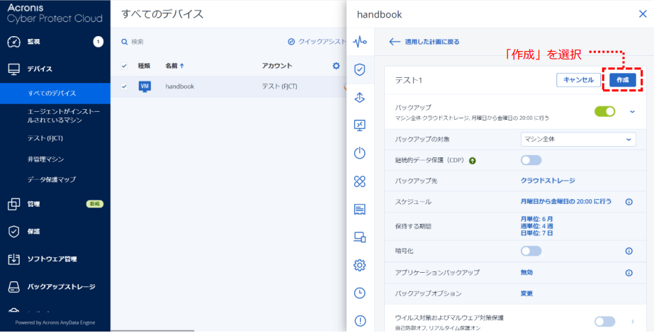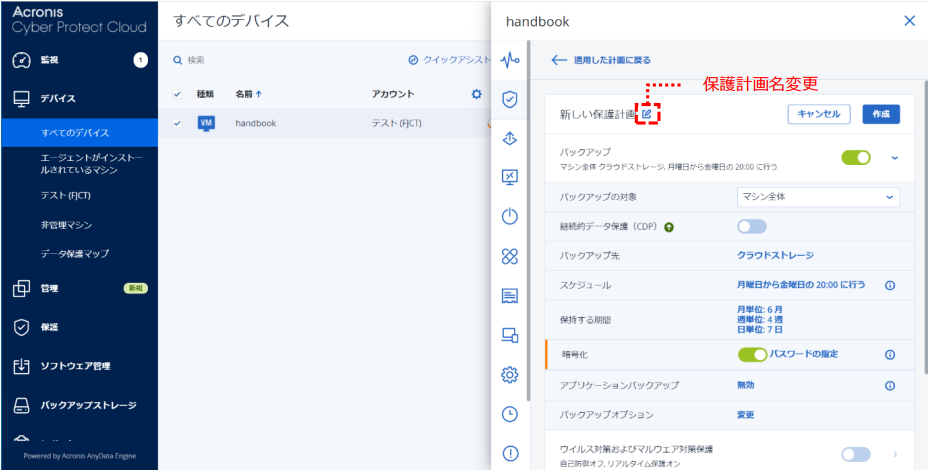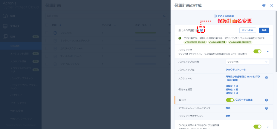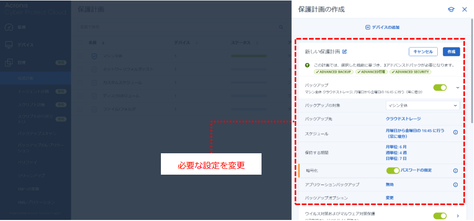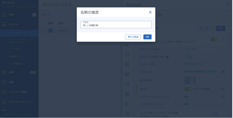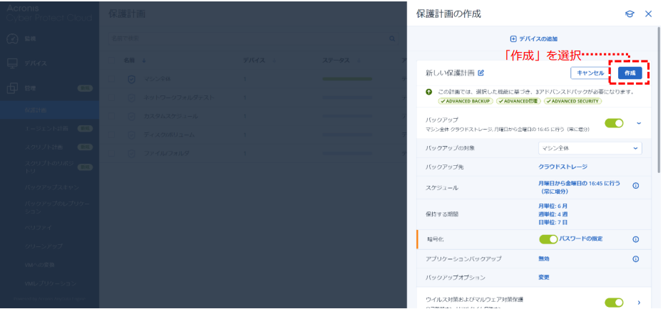 詳細はAcronis マニュアル 保護計画とモジュール より保護計画の作成 を参照してください。