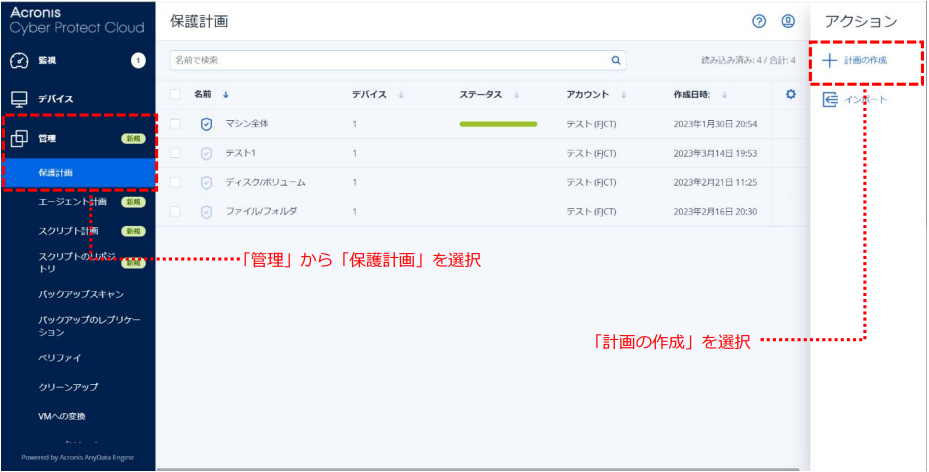 1. 「管理」から「保護計画」を選択し、「計画の作成」を選択してください。