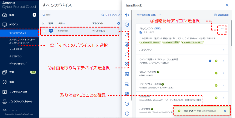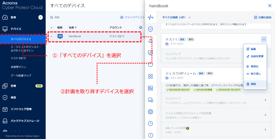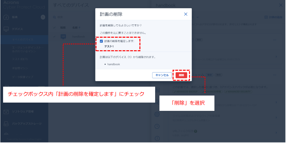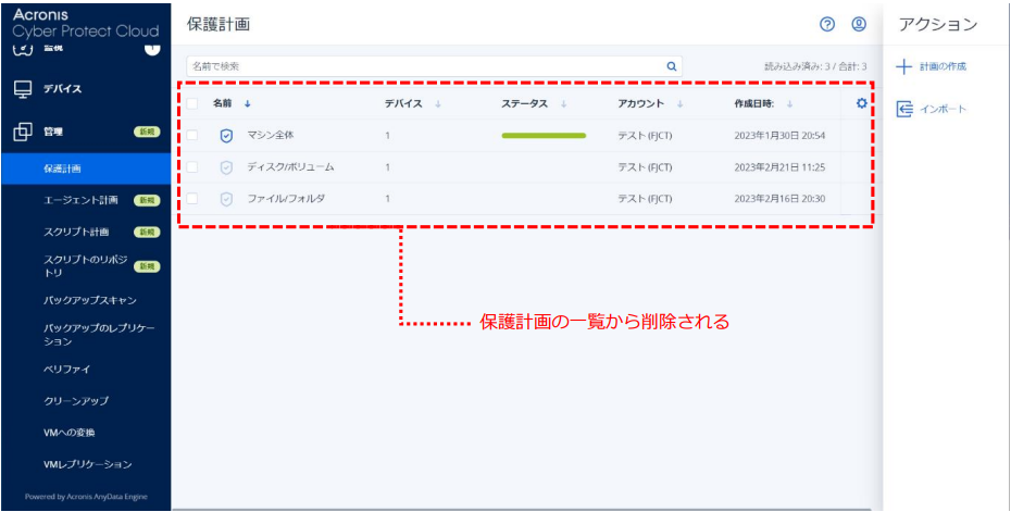 保護計画そのものを削除します、同じ保護計画を適用しているすべてのデバイスにおいても取り消しされ、保護計画自体がコンソールからも削除されます。