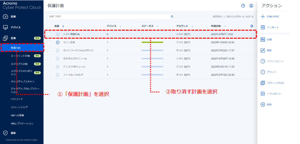 または、「管理」から「保護計画」を選択し、取り消す保護計画を選択してください。
