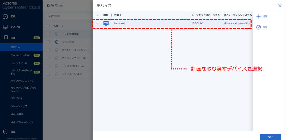 選択したデバイスから保護計画を削除します。同一の保護計画が適用された他のデバイスは引き続き保護対象となります。