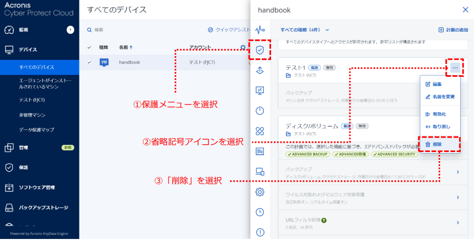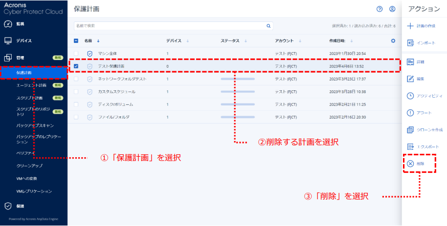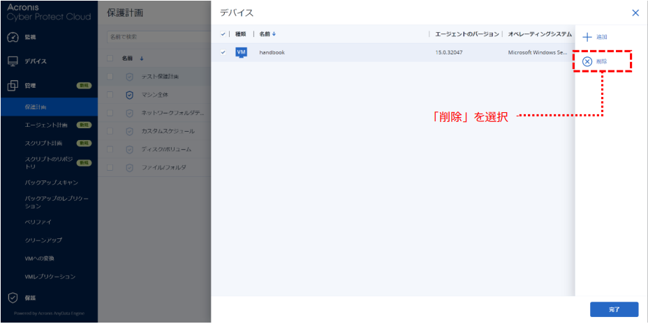 または、「管理」から「保護計画」を選択し、削除する保護計画を選択して「削除」を選択しください。