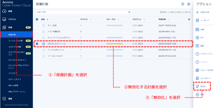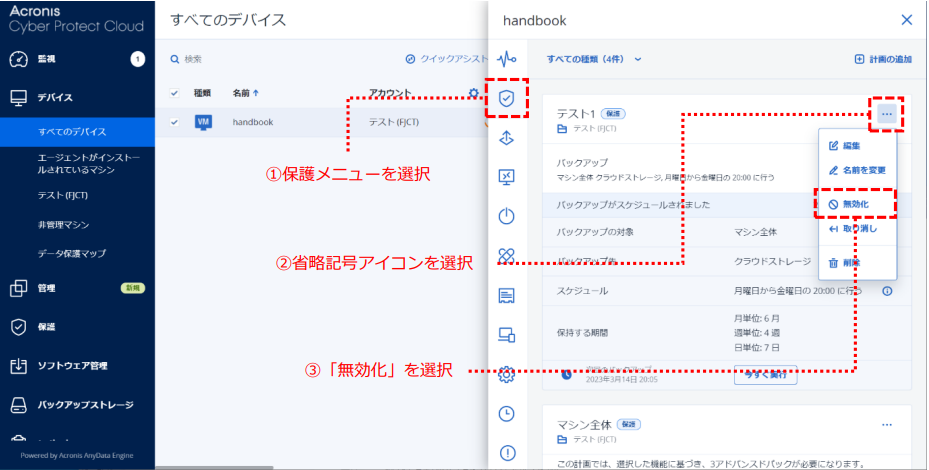 2. 保護メニューから取り消す保護計画を選択し、計画名の横にある省略記号アイコン(…)から「無効化」を選択してください。