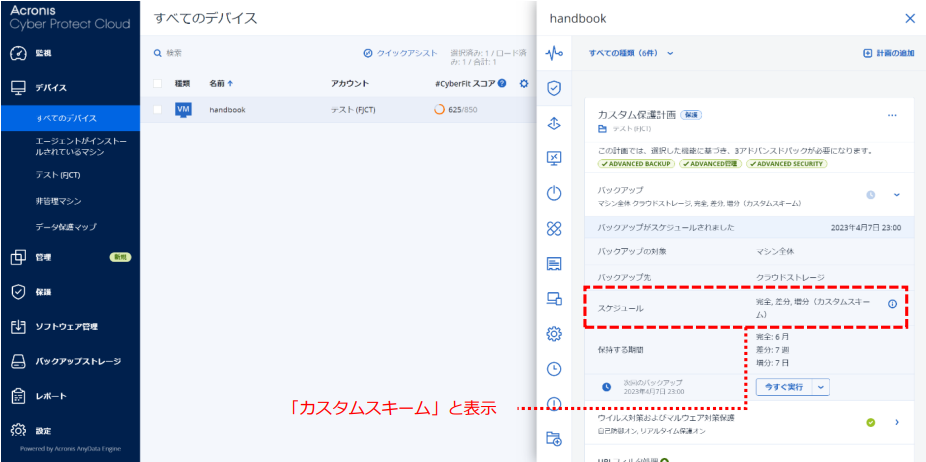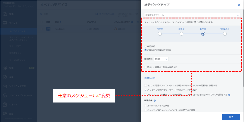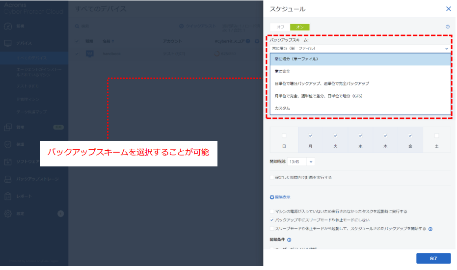 Acronis のバックアップスキームとスケジュールの詳細はAcronis マニュアル ワークロード/ファイルのバックアップを復元および管理する よりバックアップスケジュール を参照してください。