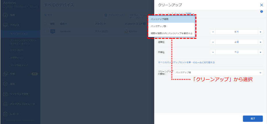 詳細はAcronis マニュアル ワークロード/ファイルのバックアップを復元および管理する より「保持ルール」を参照してください。