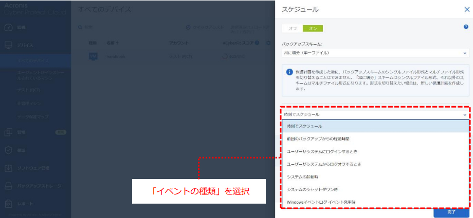 • 時刻ではなく、イベントを契機にバックアップの実行をスケジュール設定できます。