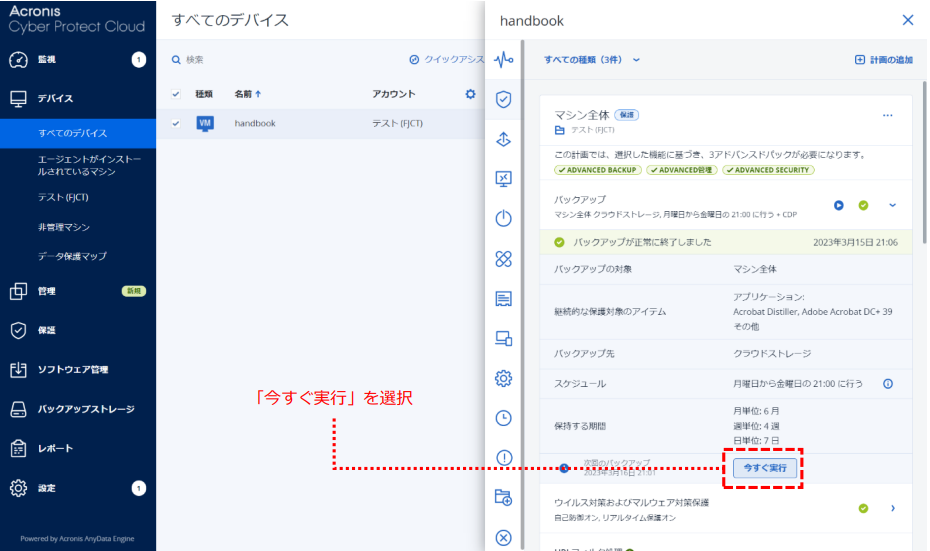 Acronis マニュアル ワークロード/ファイルのバックアップを復元および管理するバックアップスケジュール より「手動でのバックアップの実行」を参照してください。