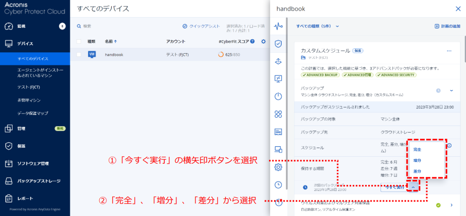 3. バックアップスキーム内に複数のバックアップ方法が含まれている場合は、「今すぐ実行」の横矢印ボタンを選択し、「完全」、「増分」、「差分」から選択してください。