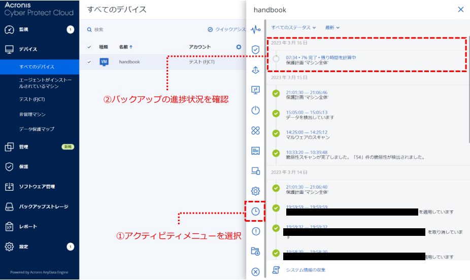 バックアップの進行状況は、アクティビティメニューから確認可能です。
