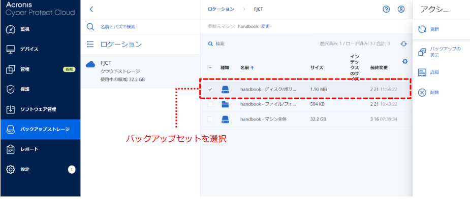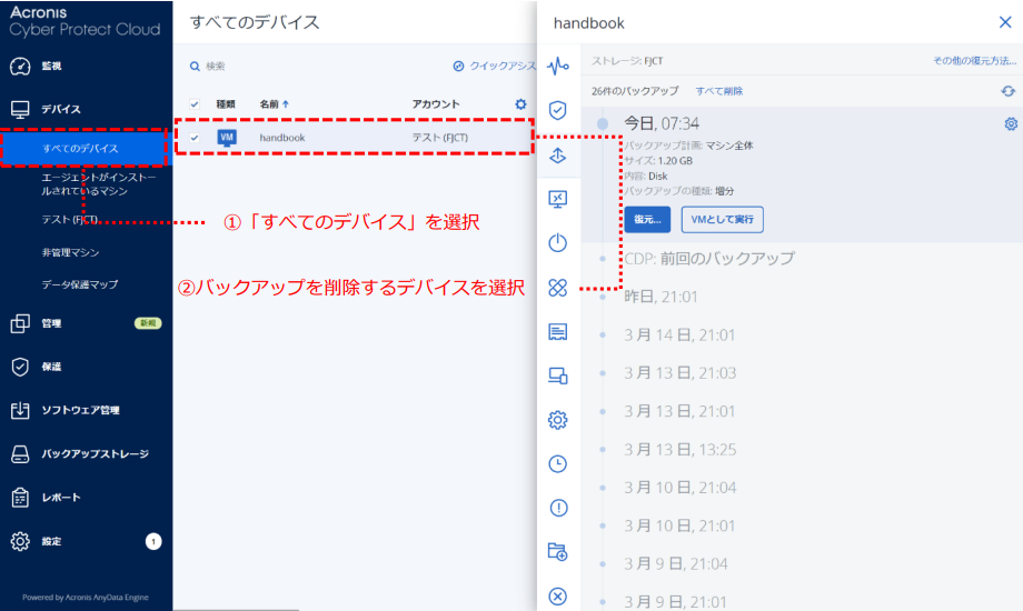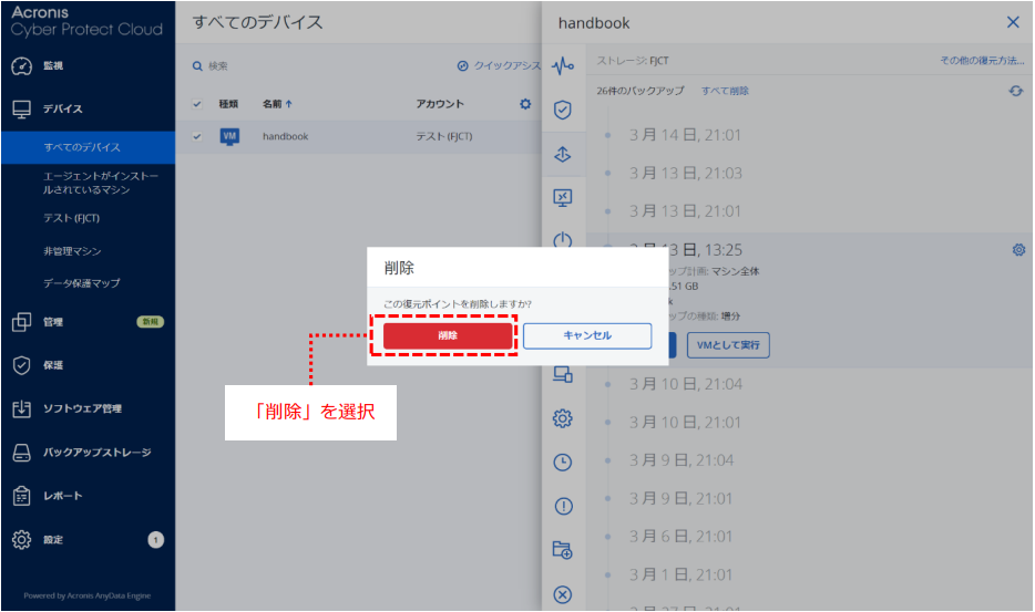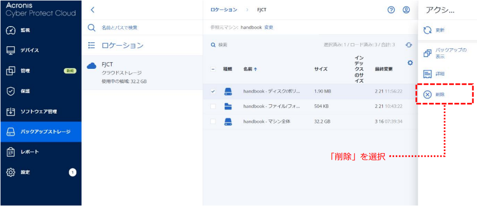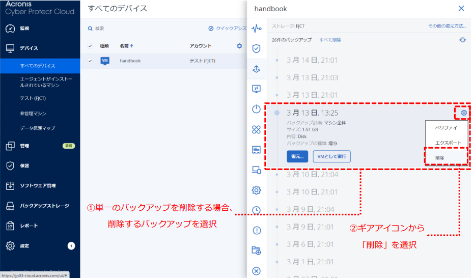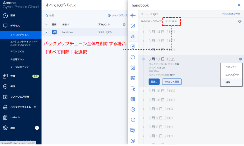 詳細は Acronis マニュアル ワークロード/ファイルのバックアップを復元および管理するバックアップの操作 より バックアップの削除 を参照してください。