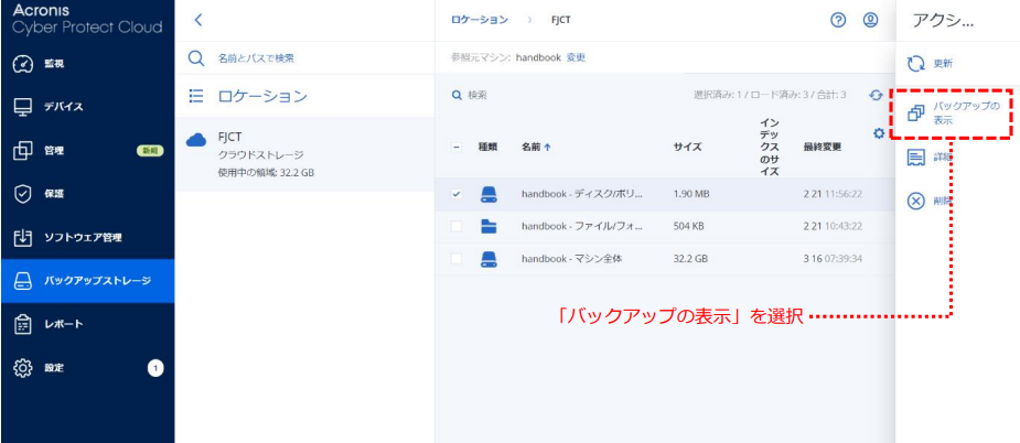 選択したセット内で単一のバックアップを削除するには、「バックアップの表示」を選択してください。