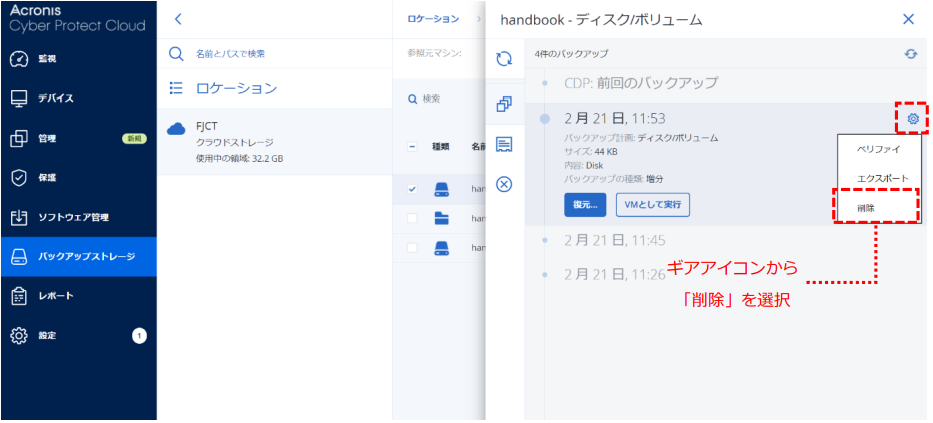 4. 削除するバックアップのギアアイコンから「削除」を選択してください。
