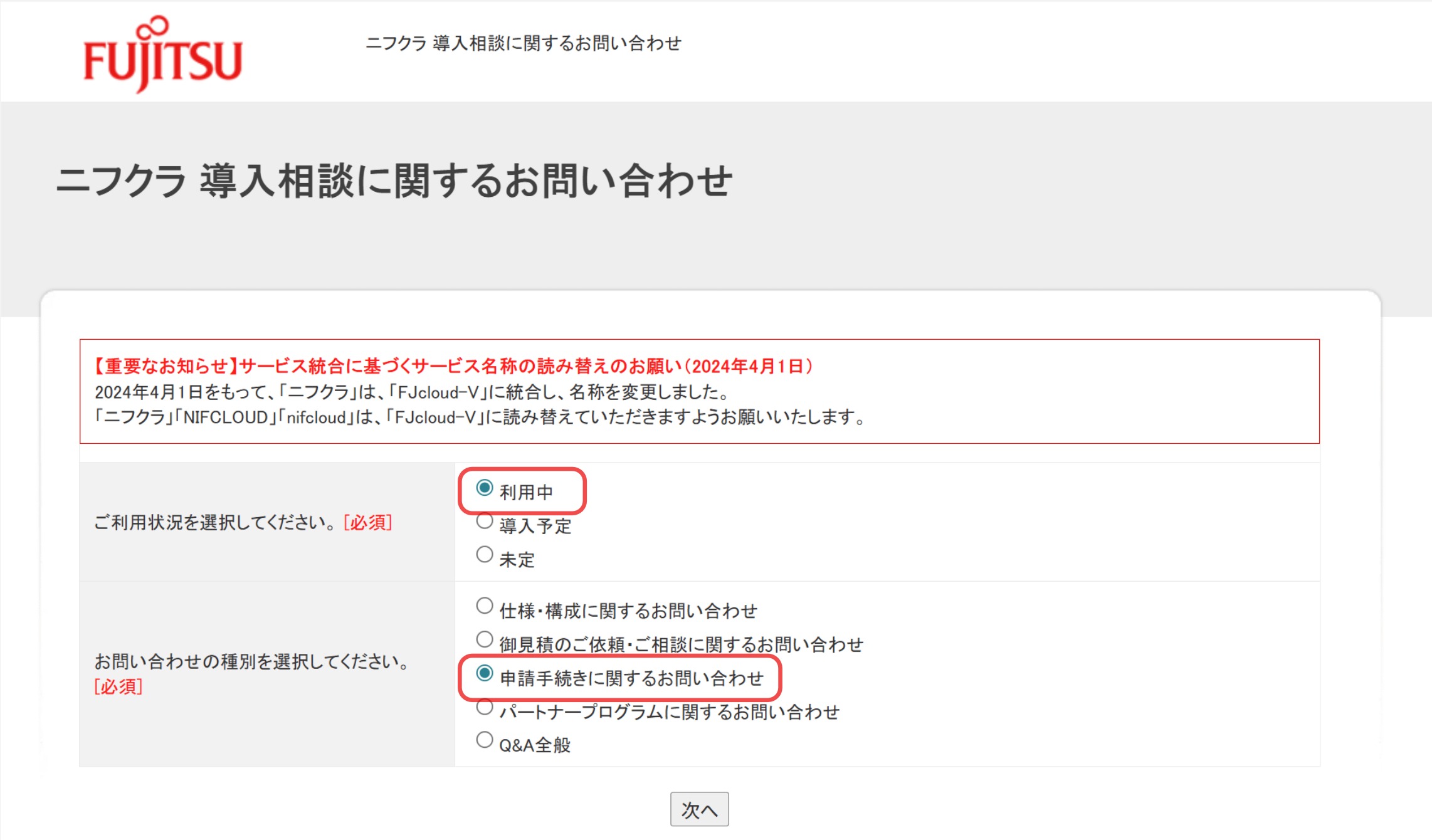 - お問い合わせ種別:申請手続きに関するお問い合わせ