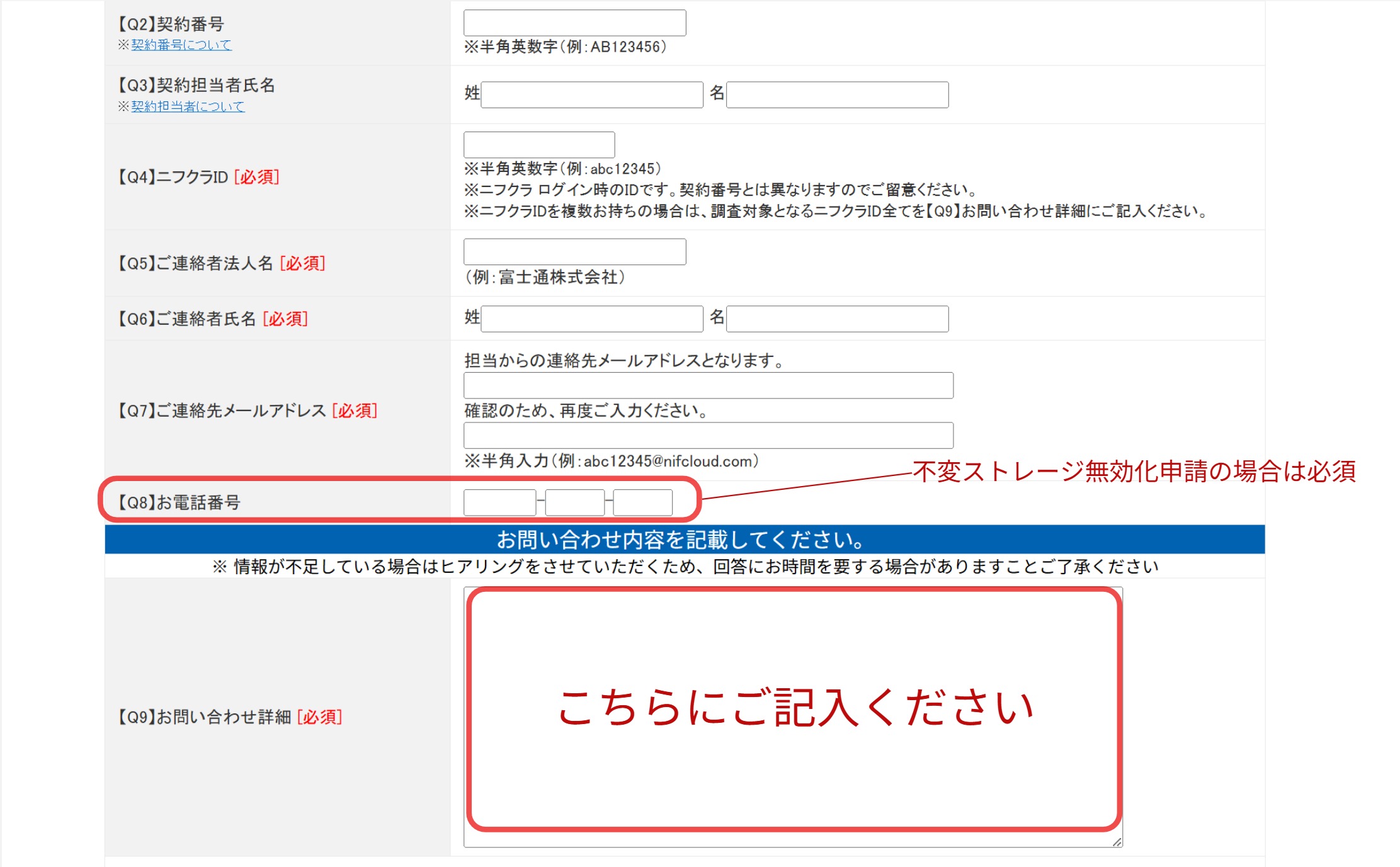 必須項目および電話番号を記入し、お問い合わせ詳細に下記フォーマットに沿って必要事項を記入します。