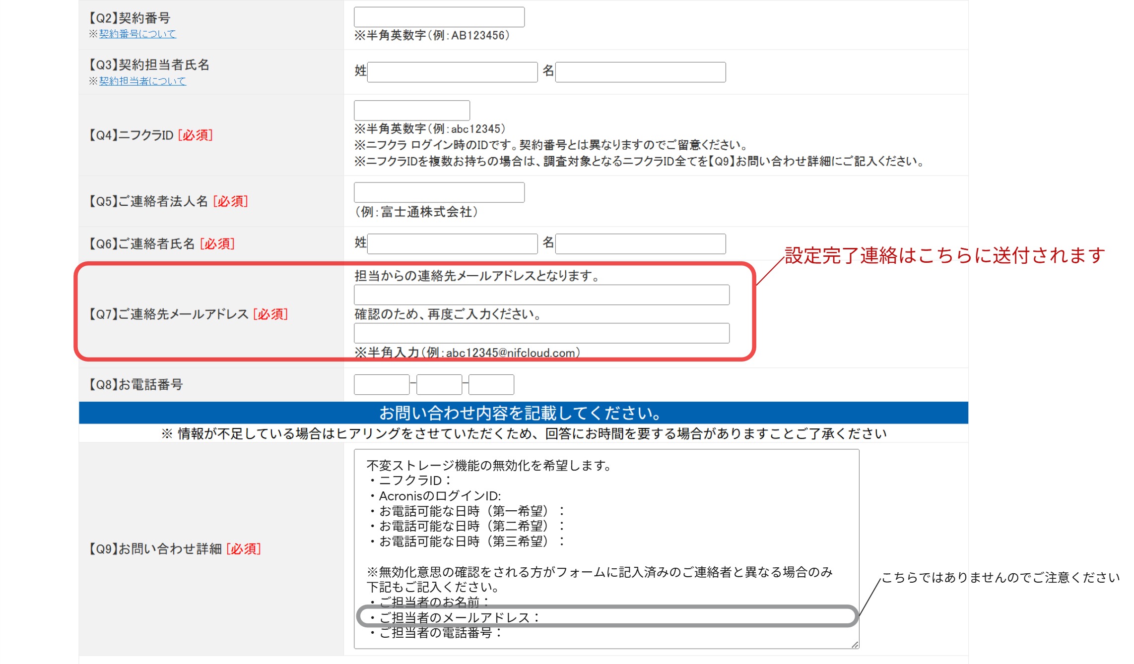 - 設定完了メールはフォームの「Q7 ご連絡先メールアドレス」に入力されたメールアドレス宛に送付します。