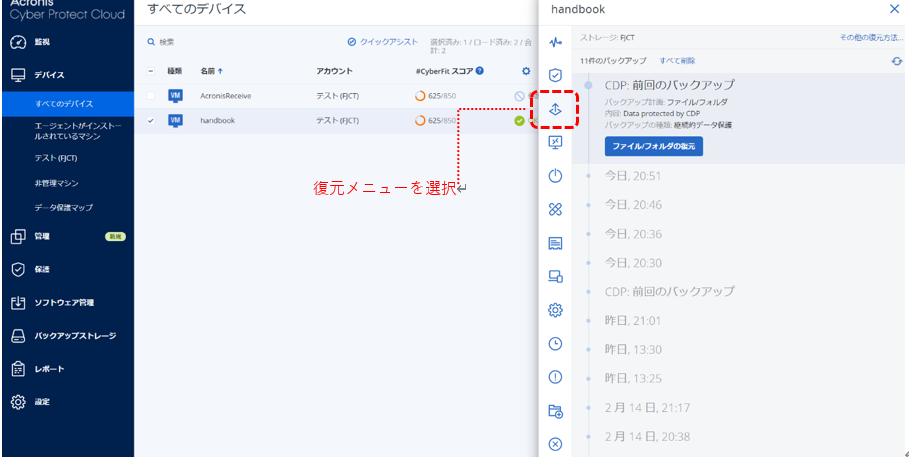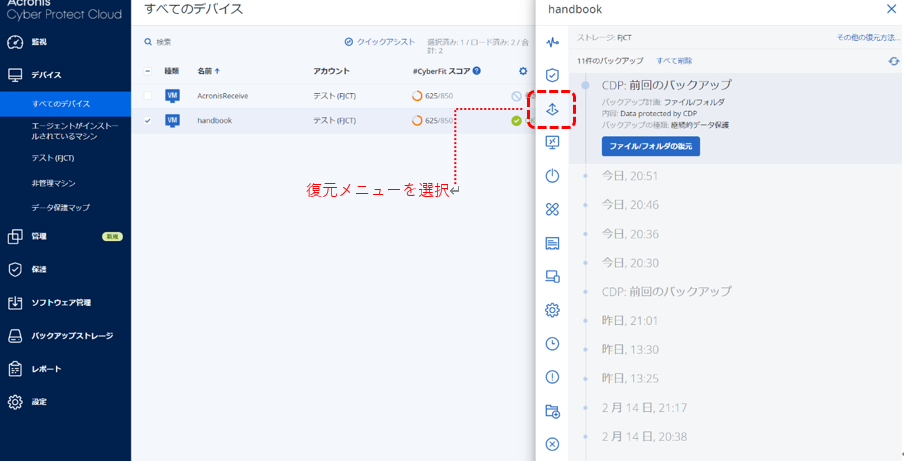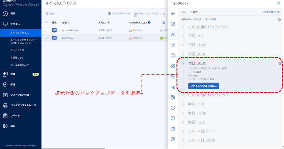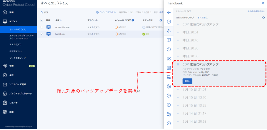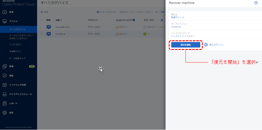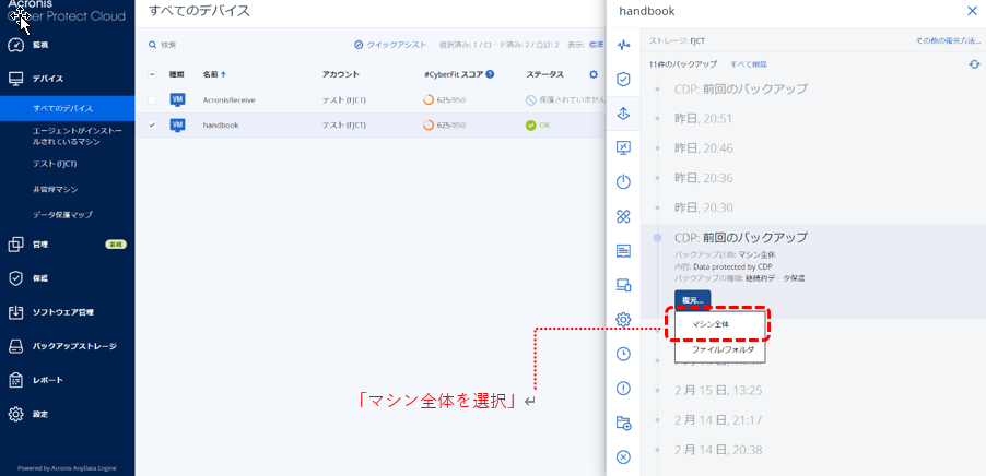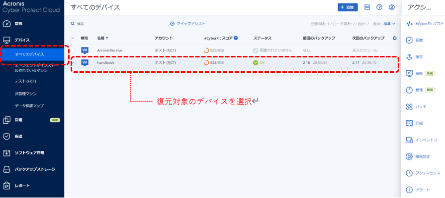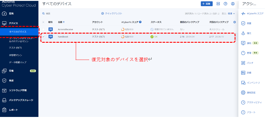 Acronis 管理画面の「すべてのデバイス」から復元対象のデバイスを選択してください。