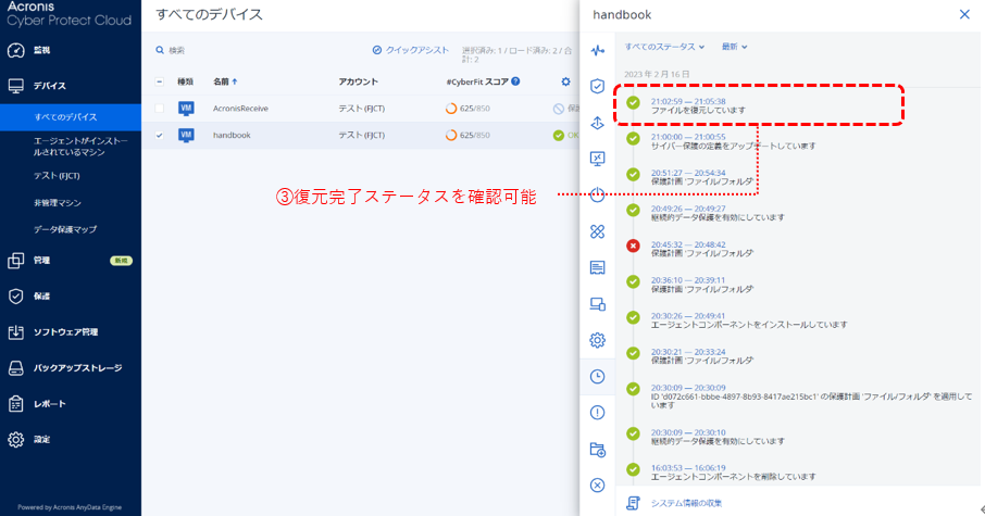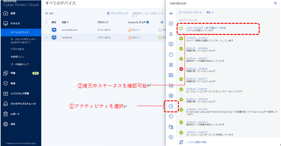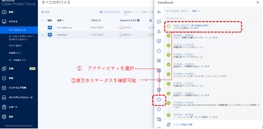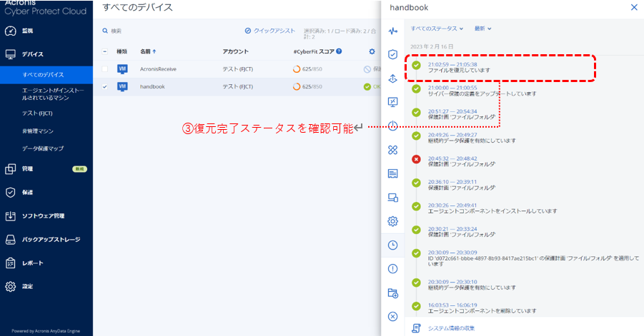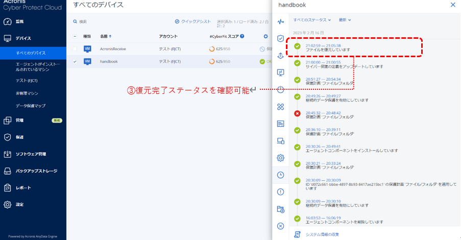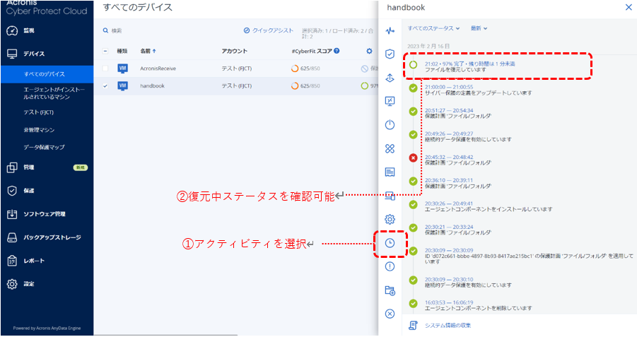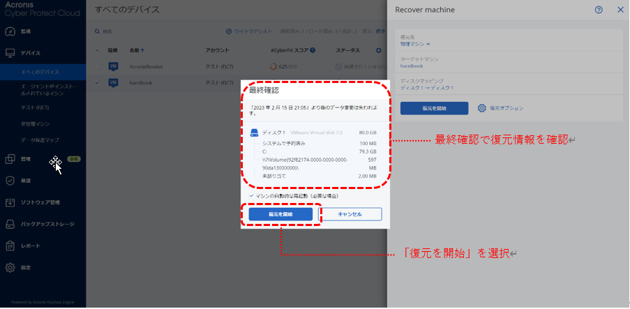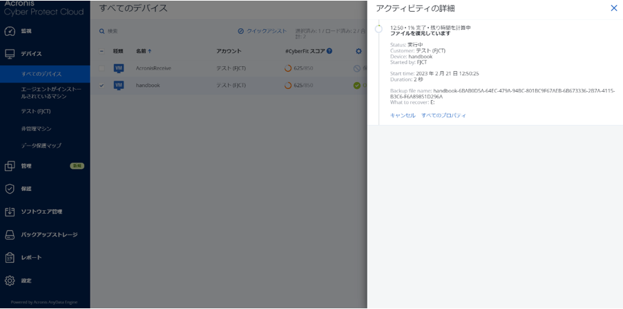 Acronis 管理画面の「すべてのデバイス」から復元対象のデバイスを選択してください。