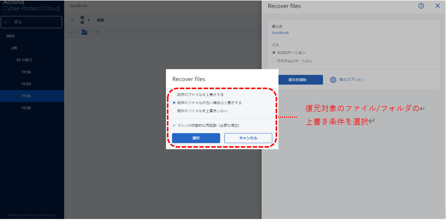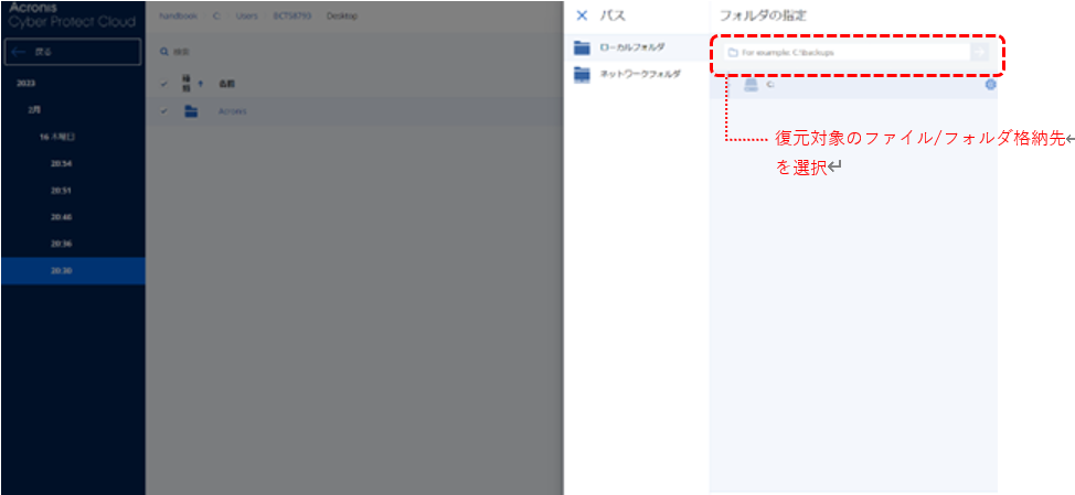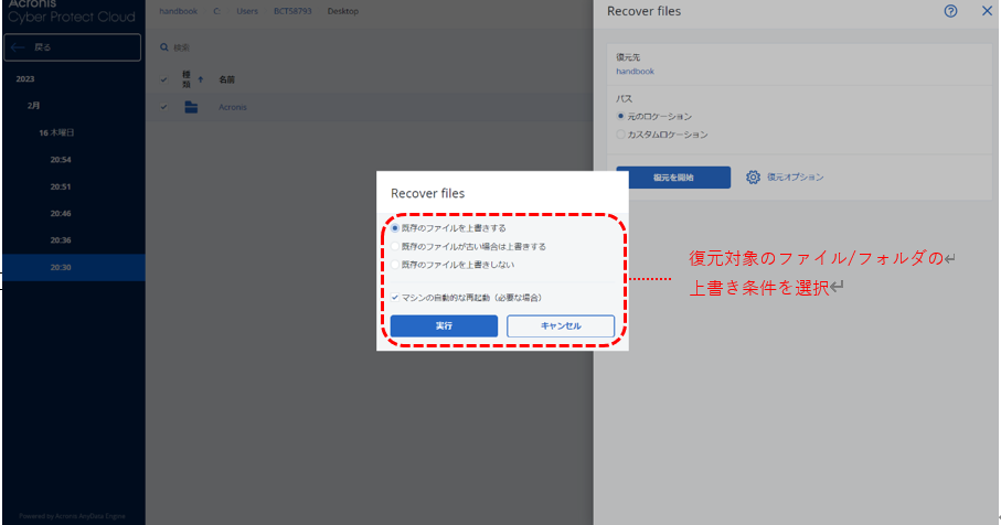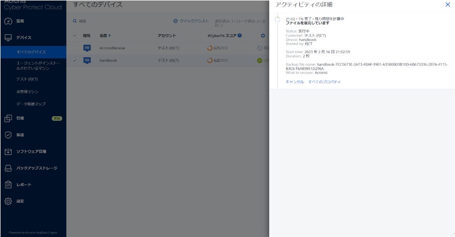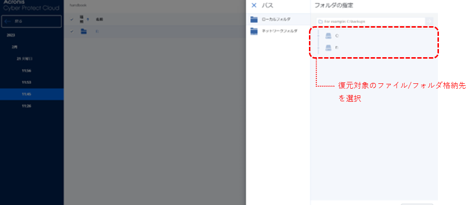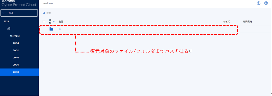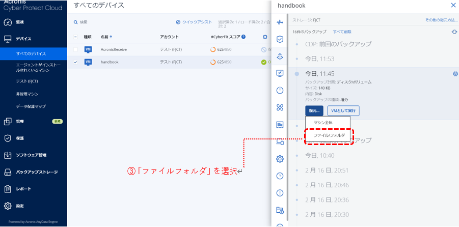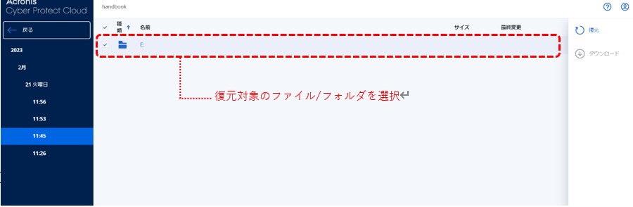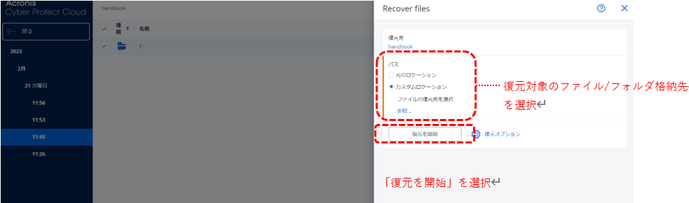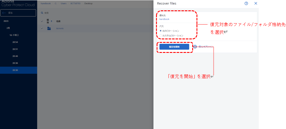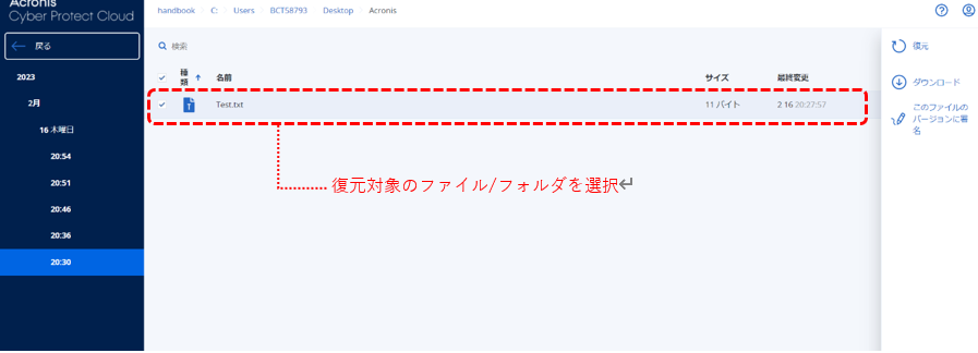 - 56109: Acronis Cyber Protect Cloud / Acronis Cyber Backup Service: ファイルの復元をベースにファイル/フォルダ単位の復元操作を説明します。
