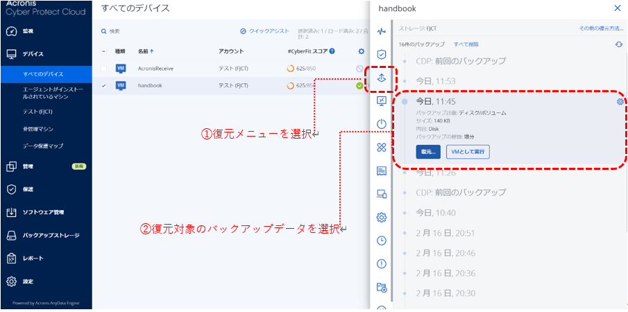 - Acronis Cyber Protect Cloud: How to restore disksをベースに、ボリューム単位の復元操作を説明します。