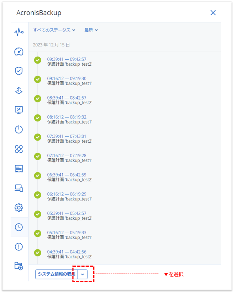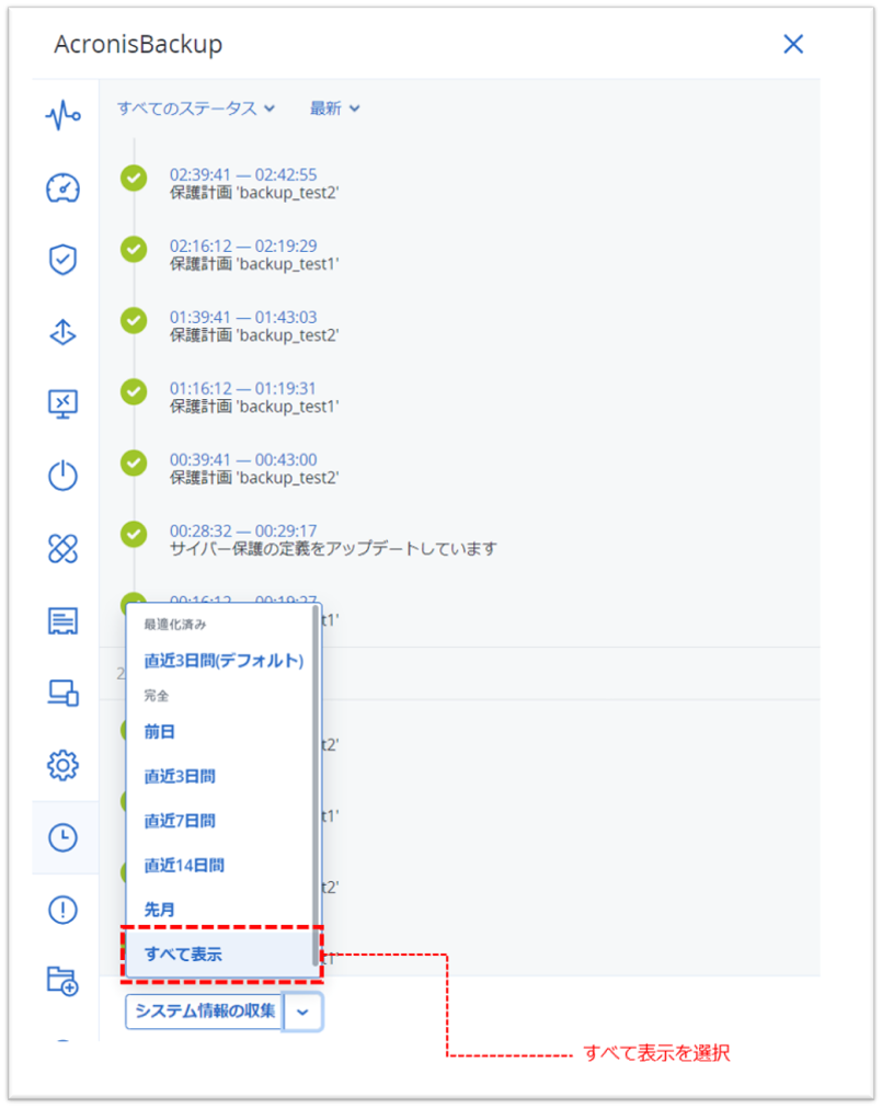 - アクティビティの一覧の画面にある [システム情報の収集] の右側のボタンをクリックし [すべて表示] をクリック