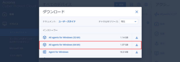 ※All agents for Windows 以外の小さいサイズのインストーラーは使用しないでください。