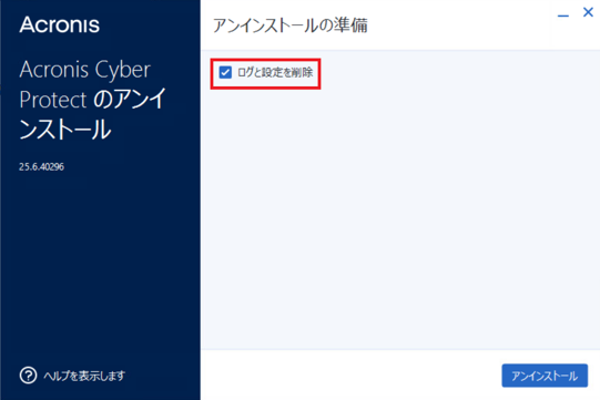 アンインストール時に[ログと構成の設定を削除する]チェックボックスをオフにしてください。